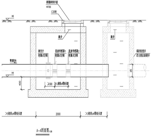 最初的設計圖紙考慮了現場(chǎng)水質(zhì)變化問(wèn)題,計劃采用時(shí)差多普勒二合一傳感器測量,果渣多的時(shí)候啟動(dòng)多普勒單傳感器測量方式,果渣少時(shí)采用時(shí)差上下游測量方式,現場(chǎng)實(shí)際了解到水中的果渣一直含量高,安裝時(shí)本著(zhù)節約成本、高性?xún)r(jià)比的優(yōu)選做了進(jìn)一步的改進(jìn),在儀表井內只用了一個(gè)抱箍就完成了流速傳感器和液位計的安裝、測量。超聲波傳感器從管道抱箍頂部直插(開(kāi)孔尺寸為30mm),壓力液位計從抱箍側下方插入安裝(開(kāi)孔尺寸為28mm)