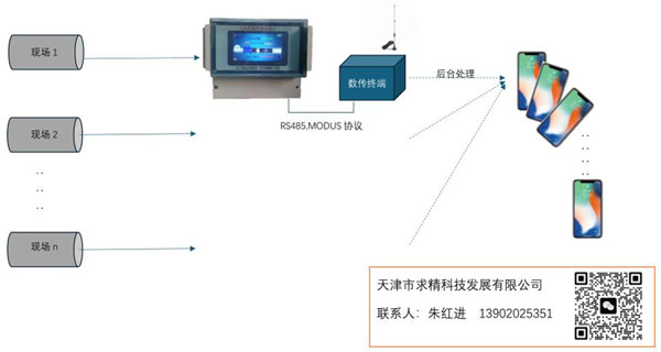 顯示儀表通過(guò)RS485傳輸給數傳終端RTU,RTU數傳終端通過(guò)微信公眾號發(fā)送數據到手機,同時(shí)也可以發(fā)送數據到監測平臺。