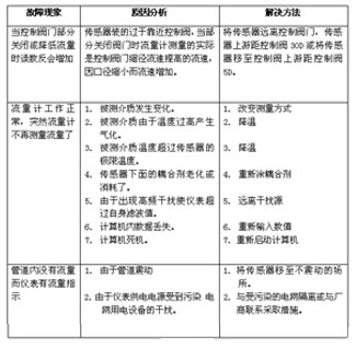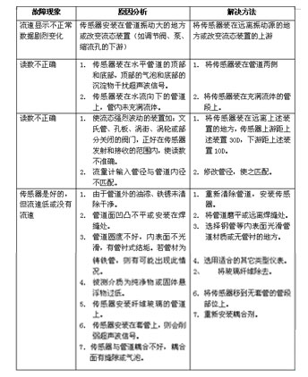 整機調試 安裝好主機和傳感器以后,可進(jìn)行整機調試: 第一步按MOD鍵進(jìn)入人機對話(huà)方式,檢查和輸入有關(guān)參數。 第二步如果測量數據不準確或不穩定或沒(méi)有數,應重新安裝傳感器,直至數據準確穩定。第三步各通道調試好以后,按ENT鍵進(jìn)入巡檢方式。 一般故障及排除方法 由于流量計器件和結構大都選用先進(jìn)國家進(jìn)口器件,所以由于器件、結構件損壞引發(fā)的故障很低,主要故障來(lái)自?xún)蓚(gè)方面。一是傳感器松動(dòng),工作不可靠;二是主機參數由于意外原因被改寫(xiě)。因為上面講到的人機對話(huà)有關(guān)參數在斷電后不會(huì )丟失,可保存一年以上。但由于電源不穩或操作不當會(huì )引起這些參數被改寫(xiě),所以請客戶(hù)特別注意這一點(diǎn)。 一般故障分析及排除方法見(jiàn)下表: |