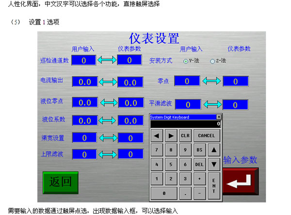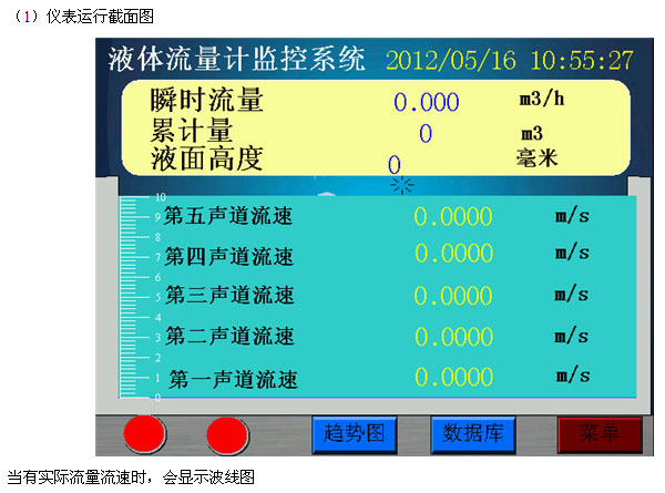 三、現場(chǎng)安裝注意事項 如果是梯型渠道需要現在沒(méi)通水情況下現場(chǎng)進(jìn)行安裝。 安裝說(shuō)明: 首先選好安裝傳感器的位置,一般要求安裝點(diǎn)之前有10倍的渠寬距離、之后有5倍的渠寬距離,這樣可以保證測量點(diǎn)水流的穩定性; 為了保證信號傳輸的穩定性,顯示儀表盡量就近安裝,傳感器與主機距離應小于200米,主機如不能放在室內應該增加室外儀表箱。 四、人機界面截圖說(shuō)明 |